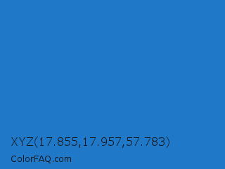 XYZ 17.855,17.957,57.783 Color is a normal blue color and the nearest color is Bright Navy Blue #1974d2. Hex code #2078c9 and RGB value is rgb(32,120,201). In RGB color space, this color is composed of 13% red, 47% green, 79% blue, In CMYK color space, this color is composed of 84% cyan, 40% magenta, 0% yellow , 21% black , In HSL color space, this color has a hue angle of 209° , 73% saturation and 46% lightness.