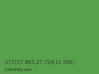 XYZ 17.865,27.724,11.066 Color is a normal green color and the nearest color is Apple #4fa83d. Hex code #58a04b and RGB value is rgb(88,160,75). In RGB color space, this color is composed of 35% red, 63% green, 29% blue, In CMYK color space, this color is composed of 45% cyan, 0% magenta, 53% yellow , 37% black , In HSL color space, this color has a hue angle of 111° , 36% saturation and 46% lightness.