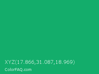 XYZ 17.866,31.087,18.969 Color is a normal green color and the nearest color is Green Crayola #1cac78. Hex code #13ad6b and RGB value is rgb(19,173,107). In RGB color space, this color is composed of 7% red, 68% green, 42% blue, In CMYK color space, this color is composed of 89% cyan, 0% magenta, 38% yellow , 32% black , In HSL color space, this color has a hue angle of 154° , 80% saturation and 38% lightness.