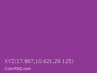 XYZ 17.867,10.621,29.125 Color is a normal magenta color and the nearest color is Vivid Violet #803790. Hex code #8e3794 and RGB value is rgb(142,55,148). In RGB color space, this color is composed of 56% red, 22% green, 58% blue, In CMYK color space, this color is composed of 4% cyan, 63% magenta, 0% yellow , 42% black , In HSL color space, this color has a hue angle of 296° , 46% saturation and 40% lightness.