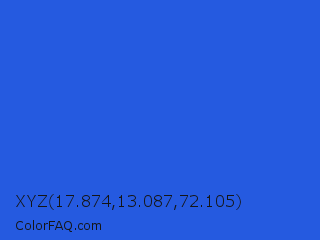 XYZ 17.874,13.087,72.105 Color is a normal blue color and the nearest color is Mariner #286acd. Hex code #255ae0 and RGB value is rgb(37,90,224). In RGB color space, this color is composed of 15% red, 35% green, 88% blue, In CMYK color space, this color is composed of 83% cyan, 60% magenta, 0% yellow , 12% black , In HSL color space, this color has a hue angle of 223° , 75% saturation and 51% lightness.