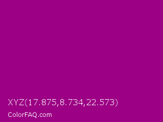 XYZ 17.875,8.734,22.573 Color is a normal magenta color and the nearest color is Dark Magenta #8b008b. Hex code #9c0084 and RGB value is rgb(156,0,132). In RGB color space, this color is composed of 61% red, 0% green, 52% blue, In CMYK color space, this color is composed of 0% cyan, 100% magenta, 15% yellow , 39% black , In HSL color space, this color has a hue angle of 309° , 100% saturation and 31% lightness.