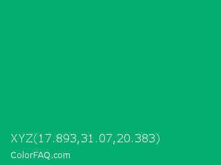 XYZ 17.893,31.07,20.383 Color is a normal green color and the nearest color is Jade #00a86b. Hex code #02ad70 and RGB value is rgb(2,173,112). In RGB color space, this color is composed of 1% red, 68% green, 44% blue, In CMYK color space, this color is composed of 99% cyan, 0% magenta, 35% yellow , 32% black , In HSL color space, this color has a hue angle of 159° , 98% saturation and 34% lightness.
