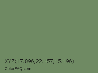 XYZ 17.896,22.457,15.196 Color is a normal green color and the nearest color is Highland #6f8e63. Hex code #6f8a63 and RGB value is rgb(111,138,99). In RGB color space, this color is composed of 44% red, 54% green, 39% blue, In CMYK color space, this color is composed of 20% cyan, 0% magenta, 28% yellow , 46% black , In HSL color space, this color has a hue angle of 102° , 16% saturation and 46% lightness.