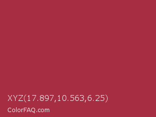 XYZ 17.897,10.563,6.25 Color is a normal red color and the nearest color is Big Dip O Ruby #9c2542. Hex code #a72e42 and RGB value is rgb(167,46,66). In RGB color space, this color is composed of 65% red, 18% green, 26% blue, In CMYK color space, this color is composed of 0% cyan, 72% magenta, 60% yellow , 35% black , In HSL color space, this color has a hue angle of 350° , 57% saturation and 42% lightness.