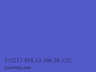 XYZ 17.919,13.296,58.122 Color is a normal blue color and the nearest color is Iris #5a4fcf. Hex code #5359cb and RGB value is rgb(83,89,203). In RGB color space, this color is composed of 33% red, 35% green, 80% blue, In CMYK color space, this color is composed of 59% cyan, 56% magenta, 0% yellow , 20% black , In HSL color space, this color has a hue angle of 237° , 54% saturation and 56% lightness.