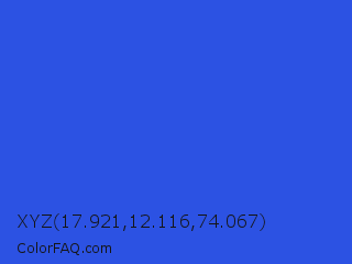 XYZ 17.921,12.116,74.067 Color is a normal blue color and the nearest color is Palatinate Blue #273be2. Hex code #2c52e3 and RGB value is rgb(44,82,227). In RGB color space, this color is composed of 17% red, 32% green, 89% blue, In CMYK color space, this color is composed of 81% cyan, 64% magenta, 0% yellow , 11% black , In HSL color space, this color has a hue angle of 228° , 77% saturation and 53% lightness.