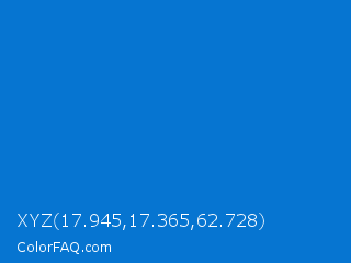 XYZ 17.945,17.365,62.728 Color is a normal blue color and the nearest color is True Blue #0073cf. Hex code #0675d1 and RGB value is rgb(6,117,209). In RGB color space, this color is composed of 2% red, 46% green, 82% blue, In CMYK color space, this color is composed of 97% cyan, 44% magenta, 0% yellow , 18% black , In HSL color space, this color has a hue angle of 207° , 94% saturation and 42% lightness.