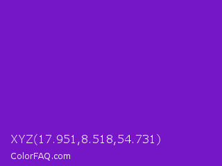XYZ 17.951,8.518,54.731 Color is a normal purple color and the nearest color is French Violet #8806ce. Hex code #7517c7 and RGB value is rgb(117,23,199). In RGB color space, this color is composed of 46% red, 9% green, 78% blue, In CMYK color space, this color is composed of 41% cyan, 88% magenta, 0% yellow , 22% black , In HSL color space, this color has a hue angle of 272° , 79% saturation and 44% lightness.