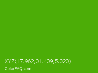XYZ 17.962,31.439,5.323 Color is a normal green color and the nearest color is Kelly Green #4cbb17. Hex code #4cad07 and RGB value is rgb(76,173,7). In RGB color space, this color is composed of 30% red, 68% green, 3% blue, In CMYK color space, this color is composed of 56% cyan, 0% magenta, 96% yellow , 32% black , In HSL color space, this color has a hue angle of 95° , 92% saturation and 35% lightness.