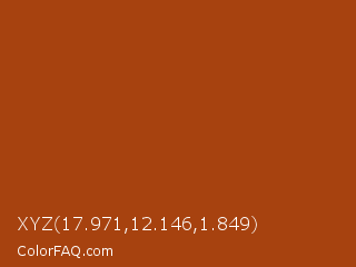 XYZ 17.971,12.146,1.849 Color is a normal orange color and the nearest color is Fire #aa4203. Hex code #a7420f and RGB value is rgb(167,66,15). In RGB color space, this color is composed of 65% red, 26% green, 6% blue, In CMYK color space, this color is composed of 0% cyan, 60% magenta, 91% yellow , 35% black , In HSL color space, this color has a hue angle of 20° , 84% saturation and 36% lightness.