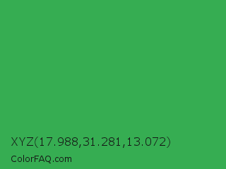 XYZ 17.988,31.281,13.072 Color is a normal green color and the nearest color is Chateau Green #40a860. Hex code #36ad52 and RGB value is rgb(54,173,82). In RGB color space, this color is composed of 21% red, 68% green, 32% blue, In CMYK color space, this color is composed of 69% cyan, 0% magenta, 53% yellow , 32% black , In HSL color space, this color has a hue angle of 134° , 52% saturation and 45% lightness.