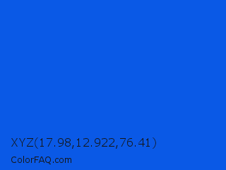 XYZ 17.98,12.922,76.41 Color is a normal blue color and the nearest color is Blue Ribbon #0066ff. Hex code #0a59e6 and RGB value is rgb(10,89,230). In RGB color space, this color is composed of 4% red, 35% green, 90% blue, In CMYK color space, this color is composed of 96% cyan, 61% magenta, 0% yellow , 10% black , In HSL color space, this color has a hue angle of 218° , 92% saturation and 47% lightness.