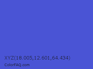 XYZ 18.005,12.601,64.434 Color is a normal blue color and the nearest color is Iris #5a4fcf. Hex code #4a54d5 and RGB value is rgb(74,84,213). In RGB color space, this color is composed of 29% red, 33% green, 84% blue, In CMYK color space, this color is composed of 65% cyan, 61% magenta, 0% yellow , 16% black , In HSL color space, this color has a hue angle of 236° , 62% saturation and 56% lightness.