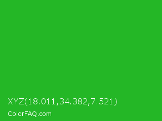 XYZ 18.011,34.382,7.521 Color is a normal green color and the nearest color is Wageningen Green #34b233. Hex code #24b726 and RGB value is rgb(36,183,38). In RGB color space, this color is composed of 14% red, 72% green, 15% blue, In CMYK color space, this color is composed of 80% cyan, 0% magenta, 79% yellow , 28% black , In HSL color space, this color has a hue angle of 121° , 67% saturation and 43% lightness.