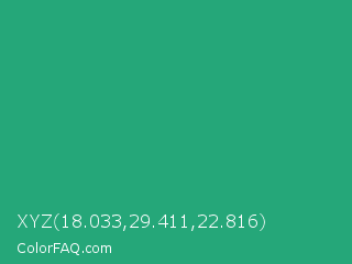 XYZ 18.033,29.411,22.816 Color is a normal green color and the nearest color is Green Crayola #1cac78. Hex code #25a779 and RGB value is rgb(37,167,121). In RGB color space, this color is composed of 15% red, 65% green, 47% blue, In CMYK color space, this color is composed of 78% cyan, 0% magenta, 28% yellow , 35% black , In HSL color space, this color has a hue angle of 159° , 64% saturation and 40% lightness.