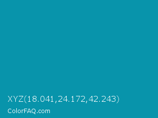 XYZ 18.041,24.172,42.243 Color is a normal cyan color and the nearest color is Blue Munsell #0093af. Hex code #0894ab and RGB value is rgb(8,148,171). In RGB color space, this color is composed of 3% red, 58% green, 67% blue, In CMYK color space, this color is composed of 95% cyan, 13% magenta, 0% yellow , 33% black , In HSL color space, this color has a hue angle of 188° , 91% saturation and 35% lightness.