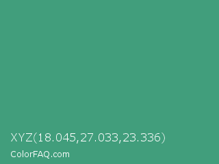XYZ 18.045,27.033,23.336 Color is a normal green color and the nearest color is Ocean Green #41aa78. Hex code #419e7c and RGB value is rgb(65,158,124). In RGB color space, this color is composed of 25% red, 62% green, 49% blue, In CMYK color space, this color is composed of 59% cyan, 0% magenta, 22% yellow , 38% black , In HSL color space, this color has a hue angle of 158° , 42% saturation and 44% lightness.