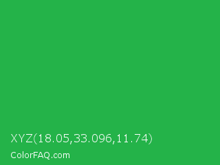 XYZ 18.05,33.096,11.74 Color is a normal green color and the nearest color is Wageningen Green #34b233. Hex code #24b349 and RGB value is rgb(36,179,73). In RGB color space, this color is composed of 14% red, 70% green, 29% blue, In CMYK color space, this color is composed of 80% cyan, 0% magenta, 59% yellow , 30% black , In HSL color space, this color has a hue angle of 136° , 67% saturation and 42% lightness.