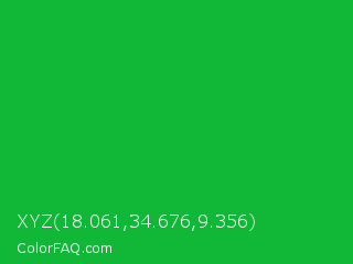 XYZ 18.061,34.676,9.356 Color is a normal green color and the nearest color is Dark Pastel Green #03c03c. Hex code #11b837 and RGB value is rgb(17,184,55). In RGB color space, this color is composed of 7% red, 72% green, 22% blue, In CMYK color space, this color is composed of 91% cyan, 0% magenta, 70% yellow , 28% black , In HSL color space, this color has a hue angle of 134° , 83% saturation and 39% lightness.