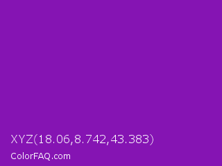 XYZ 18.06,8.742,43.383 Color is a normal purple color and the nearest color is Violet RYB #8601af. Hex code #8514b3 and RGB value is rgb(133,20,179). In RGB color space, this color is composed of 52% red, 8% green, 70% blue, In CMYK color space, this color is composed of 26% cyan, 89% magenta, 0% yellow , 30% black , In HSL color space, this color has a hue angle of 283° , 80% saturation and 39% lightness.