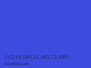 XYZ 18.093,11.493,72.499 Color is a normal blue color and the nearest color is Palatinate Blue #273be2. Hex code #3e4be1 and RGB value is rgb(62,75,225). In RGB color space, this color is composed of 24% red, 29% green, 88% blue, In CMYK color space, this color is composed of 72% cyan, 67% magenta, 0% yellow , 12% black , In HSL color space, this color has a hue angle of 235° , 73% saturation and 56% lightness.