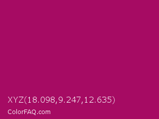 XYZ 18.098,9.247,12.635 Color is a normal magenta color and the nearest color is Jazzberry Jam #a50b5e. Hex code #a60b63 and RGB value is rgb(166,11,99). In RGB color space, this color is composed of 65% red, 4% green, 39% blue, In CMYK color space, this color is composed of 0% cyan, 93% magenta, 40% yellow , 35% black , In HSL color space, this color has a hue angle of 326° , 88% saturation and 35% lightness.