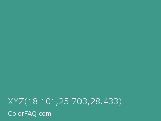 XYZ 18.101,25.703,28.433 Color is a normal cyan color and the nearest color is Zomp #39a78e. Hex code #3f998b and RGB value is rgb(63,153,139). In RGB color space, this color is composed of 25% red, 60% green, 55% blue, In CMYK color space, this color is composed of 59% cyan, 0% magenta, 9% yellow , 40% black , In HSL color space, this color has a hue angle of 171° , 42% saturation and 42% lightness.