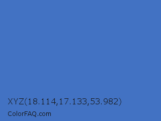 XYZ 18.114,17.133,53.982 Color is a normal blue color and the nearest color is Han Blue #446ccf. Hex code #4272c3 and RGB value is rgb(66,114,195). In RGB color space, this color is composed of 26% red, 45% green, 76% blue, In CMYK color space, this color is composed of 66% cyan, 42% magenta, 0% yellow , 24% black , In HSL color space, this color has a hue angle of 218° , 52% saturation and 51% lightness.
