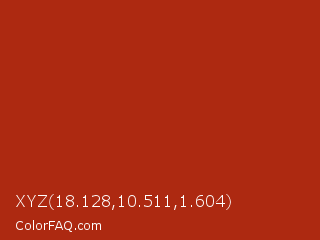 XYZ 18.128,10.511,1.604 Color is a normal red color and the nearest color is Tabasco #a02712. Hex code #ad2911 and RGB value is rgb(173,41,17). In RGB color space, this color is composed of 68% red, 16% green, 7% blue, In CMYK color space, this color is composed of 0% cyan, 76% magenta, 90% yellow , 32% black , In HSL color space, this color has a hue angle of 9° , 82% saturation and 37% lightness.