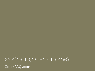 XYZ 18.13,19.813,13.458 Color is a normal yellow color and the nearest color is Shadow #8a795d. Hex code #807c5e and RGB value is rgb(128,124,94). In RGB color space, this color is composed of 50% red, 49% green, 37% blue, In CMYK color space, this color is composed of 0% cyan, 3% magenta, 27% yellow , 50% black , In HSL color space, this color has a hue angle of 53° , 15% saturation and 44% lightness.