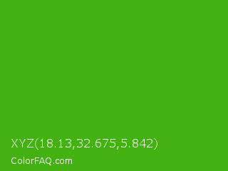 XYZ 18.13,32.675,5.842 Color is a normal green color and the nearest color is Kelly Green #4cbb17. Hex code #43b110 and RGB value is rgb(67,177,16). In RGB color space, this color is composed of 26% red, 69% green, 6% blue, In CMYK color space, this color is composed of 62% cyan, 0% magenta, 91% yellow , 31% black , In HSL color space, this color has a hue angle of 101° , 83% saturation and 38% lightness.