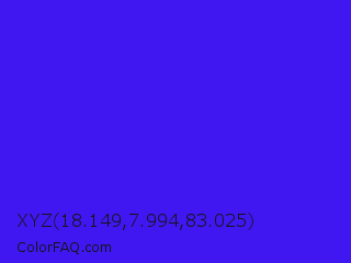 XYZ 18.149,7.994,83.025 Color is a normal indigo color and the nearest color is Han Purple #5218fa. Hex code #4017f0 and RGB value is rgb(64,23,240). In RGB color space, this color is composed of 25% red, 9% green, 94% blue, In CMYK color space, this color is composed of 73% cyan, 90% magenta, 0% yellow , 6% black , In HSL color space, this color has a hue angle of 251° , 88% saturation and 52% lightness.