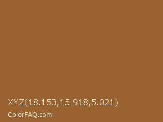 XYZ 18.153,15.918,5.021 Color is a normal orange color and the nearest color is Coconut #965a3e. Hex code #996331 and RGB value is rgb(153,99,49). In RGB color space, this color is composed of 60% red, 39% green, 19% blue, In CMYK color space, this color is composed of 0% cyan, 35% magenta, 68% yellow , 40% black , In HSL color space, this color has a hue angle of 29° , 51% saturation and 40% lightness.