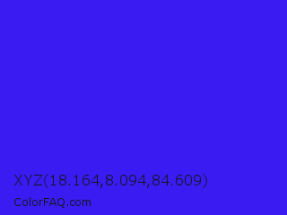 XYZ 18.164,8.094,84.609 Color is a normal indigo color and the nearest color is Han Purple #5218fa. Hex code #3a1bf2 and RGB value is rgb(58,27,242). In RGB color space, this color is composed of 23% red, 11% green, 95% blue, In CMYK color space, this color is composed of 76% cyan, 89% magenta, 0% yellow , 5% black , In HSL color space, this color has a hue angle of 249° , 89% saturation and 53% lightness.