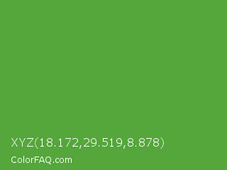 XYZ 18.172,29.519,8.878 Color is a normal green color and the nearest color is Apple #4fa83d. Hex code #55a63b and RGB value is rgb(85,166,59). In RGB color space, this color is composed of 33% red, 65% green, 23% blue, In CMYK color space, this color is composed of 49% cyan, 0% magenta, 64% yellow , 35% black , In HSL color space, this color has a hue angle of 105° , 48% saturation and 44% lightness.