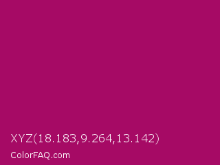 XYZ 18.183,9.264,13.142 Color is a normal magenta color and the nearest color is Jazzberry Jam #a50b5e. Hex code #a60a65 and RGB value is rgb(166,10,101). In RGB color space, this color is composed of 65% red, 4% green, 40% blue, In CMYK color space, this color is composed of 0% cyan, 94% magenta, 39% yellow , 35% black , In HSL color space, this color has a hue angle of 325° , 89% saturation and 35% lightness.