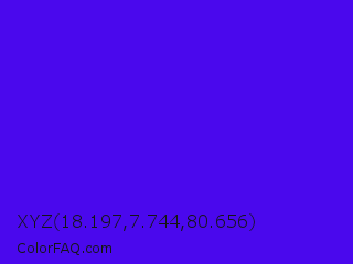 XYZ 18.197,7.744,80.656 Color is a normal indigo color and the nearest color is Han Purple #5218fa. Hex code #4a08ed and RGB value is rgb(74,8,237). In RGB color space, this color is composed of 29% red, 3% green, 93% blue, In CMYK color space, this color is composed of 69% cyan, 97% magenta, 0% yellow , 7% black , In HSL color space, this color has a hue angle of 257° , 93% saturation and 48% lightness.