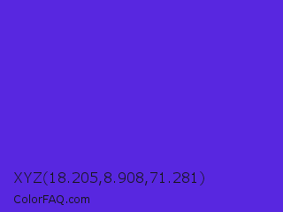 XYZ 18.205,8.908,71.281 Color is a normal indigo color and the nearest color is Han Purple #5218fa. Hex code #5827e0 and RGB value is rgb(88,39,224). In RGB color space, this color is composed of 35% red, 15% green, 88% blue, In CMYK color space, this color is composed of 61% cyan, 83% magenta, 0% yellow , 12% black , In HSL color space, this color has a hue angle of 256° , 75% saturation and 52% lightness.