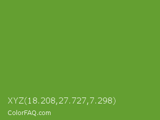 XYZ 18.208,27.727,7.298 Color is a normal green color and the nearest color is Green RYB #66b032. Hex code #649f31 and RGB value is rgb(100,159,49). In RGB color space, this color is composed of 39% red, 62% green, 19% blue, In CMYK color space, this color is composed of 37% cyan, 0% magenta, 69% yellow , 38% black , In HSL color space, this color has a hue angle of 92° , 53% saturation and 41% lightness.