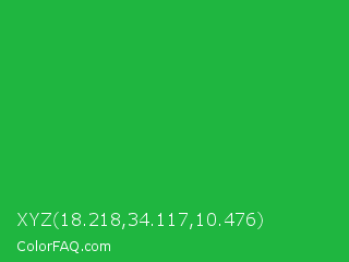 XYZ 18.218,34.117,10.476 Color is a normal green color and the nearest color is Wageningen Green #34b233. Hex code #1fb640 and RGB value is rgb(31,182,64). In RGB color space, this color is composed of 12% red, 71% green, 25% blue, In CMYK color space, this color is composed of 83% cyan, 0% magenta, 65% yellow , 29% black , In HSL color space, this color has a hue angle of 133° , 71% saturation and 42% lightness.