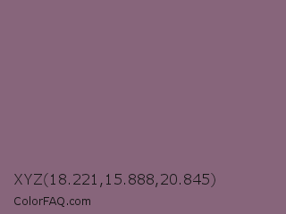 XYZ 18.221,15.888,20.845 Color is a normal magenta color and the nearest color is Chinese Violet #856088. Hex code #87657b and RGB value is rgb(135,101,123). In RGB color space, this color is composed of 53% red, 40% green, 48% blue, In CMYK color space, this color is composed of 0% cyan, 25% magenta, 9% yellow , 47% black , In HSL color space, this color has a hue angle of 321° , 14% saturation and 46% lightness.