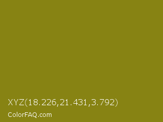 XYZ 18.226,21.431,3.792 Color is a dark yellow color and the nearest color is Trendy Green #7c881a. Hex code #878313 and RGB value is rgb(135,131,19). In RGB color space, this color is composed of 53% red, 51% green, 7% blue, In CMYK color space, this color is composed of 0% cyan, 3% magenta, 86% yellow , 47% black , In HSL color space, this color has a hue angle of 58° , 75% saturation and 30% lightness.