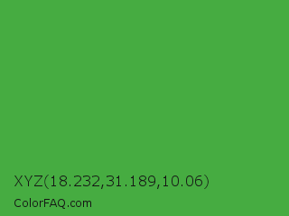 XYZ 18.232,31.189,10.06 Color is a normal green color and the nearest color is Apple #4fa83d. Hex code #46ac41 and RGB value is rgb(70,172,65). In RGB color space, this color is composed of 27% red, 67% green, 25% blue, In CMYK color space, this color is composed of 59% cyan, 0% magenta, 62% yellow , 33% black , In HSL color space, this color has a hue angle of 117° , 45% saturation and 46% lightness.