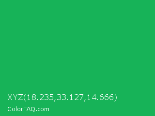 XYZ 18.235,33.127,14.666 Color is a normal green color and the nearest color is Green Pigment #00a550. Hex code #17b358 and RGB value is rgb(23,179,88). In RGB color space, this color is composed of 9% red, 70% green, 35% blue, In CMYK color space, this color is composed of 87% cyan, 0% magenta, 51% yellow , 30% black , In HSL color space, this color has a hue angle of 145° , 77% saturation and 40% lightness.
