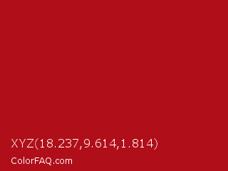 XYZ 18.237,9.614,1.814 Color is a normal red color and the nearest color is Carnelian #b31b1b. Hex code #b00e19 and RGB value is rgb(176,14,25). In RGB color space, this color is composed of 69% red, 5% green, 10% blue, In CMYK color space, this color is composed of 0% cyan, 92% magenta, 86% yellow , 31% black , In HSL color space, this color has a hue angle of 356° , 85% saturation and 37% lightness.