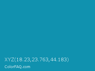 XYZ 18.23,23.763,44.183 Color is a normal cyan color and the nearest color is Blue Green #0d98ba. Hex code #1092af and RGB value is rgb(16,146,175). In RGB color space, this color is composed of 6% red, 57% green, 69% blue, In CMYK color space, this color is composed of 91% cyan, 17% magenta, 0% yellow , 31% black , In HSL color space, this color has a hue angle of 191° , 83% saturation and 37% lightness.