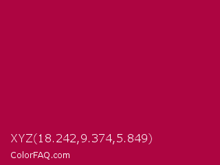 XYZ 18.242,9.374,5.849 Color is a normal rose color and the nearest color is Shiraz #b20931. Hex code #ad0541 and RGB value is rgb(173,5,65). In RGB color space, this color is composed of 68% red, 2% green, 25% blue, In CMYK color space, this color is composed of 0% cyan, 97% magenta, 62% yellow , 32% black , In HSL color space, this color has a hue angle of 339° , 94% saturation and 35% lightness.