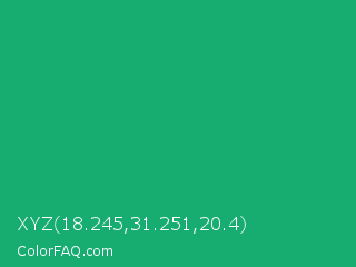 XYZ 18.245,31.251,20.4 Color is a normal green color and the nearest color is Green Crayola #1cac78. Hex code #18ad70 and RGB value is rgb(24,173,112). In RGB color space, this color is composed of 9% red, 68% green, 44% blue, In CMYK color space, this color is composed of 86% cyan, 0% magenta, 35% yellow , 32% black , In HSL color space, this color has a hue angle of 155° , 76% saturation and 39% lightness.
