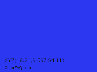 XYZ 18.24,9.597,84.11 Color is a normal blue color and the nearest color is Palatinate Blue #273be2. Hex code #2b37f1 and RGB value is rgb(43,55,241). In RGB color space, this color is composed of 17% red, 22% green, 95% blue, In CMYK color space, this color is composed of 82% cyan, 77% magenta, 0% yellow , 5% black , In HSL color space, this color has a hue angle of 236° , 88% saturation and 56% lightness.